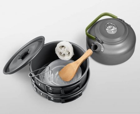 Même si une batterie de cuisine pour camping ne se juge pas (seulement) au nombre de pièces qu’elle contient, il est toujours intéressant d’avoir un set complet pour éviter des achats supplémentaires. Sur cet aspect, l’ensemble Terra Hiker marque un bon point. Malgré son prix serré, il offre une belle sélection de pièces : une casserole de 2 litres, une poêle de 1 litre, une théière de 0,8 L, trois (03) bols, un couvercle, une cuillère à riz en bambou, une louche de service et une éponge de nettoyage.
