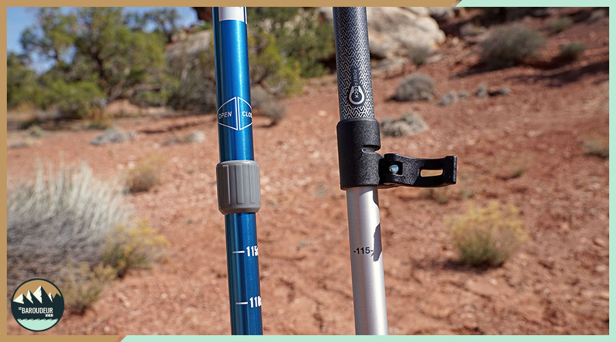 Les bâtons de marche ont un système de verrouillage interne ou externe pour maintenir les sections du bâton en place. Les systèmes de verrouillage internes utilisent généralement un « verrou tournant », qui élargit un petit support à l’intérieur du bâton lorsqu’il est tordu pour maintenir les sections en place. Les systèmes de verrouillage externes, ou «verrous», utilisent un levier pour exercer une pression sur la tige et maintenir les deux sections en place. Les serrures à torsion sont légèrement plus compliquées que les serrures à cliquet, elles ont donc tendance à fonctionner un peu moins bien, surtout quand beaucoup de poussière et de débris s’accumulent dans les bâtons. Les verrous à cliquet tendent à être plus fiables au fil du temps, mais nous avons déjà expérimenté des bâtons qui utilisaient les deux méthodes de verrouillage sans problème.