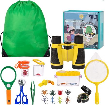Certains kits mobilisent des compétences d’observation et d’interaction avec la nature, et encouragent les activités en extérieur. Ce sont ceux qui promettent le plus d’heures d’utilisation, finalement, puisqu’ils consistent principalement en une série d’outils et d’accessoires que l’enfant pourra utiliser à l’occasion de chaque sortie — comme une boussole, ou des jumelles. Ils constituent un excellent moyen de canaliser un enfant énergique tout en l’encourageant à apprendre de nouvelles choses.