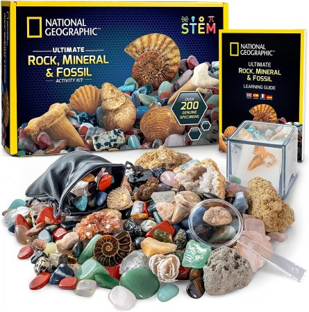 Comme pour Tacobear, ce kit propose un bon équilibre entre des activités en intérieur et en extérieur. L’enfant peut commencer par observer, à la maison, une des 200 pièces incluses — géodes, cristaux, fossiles, pierres volcaniques — et en apprendre davantage sur leurs propriétés et leur histoire. Mais le kit encourage aussi explicitement à l’exploration et à la recherche de ses propres fossiles dans la nature.