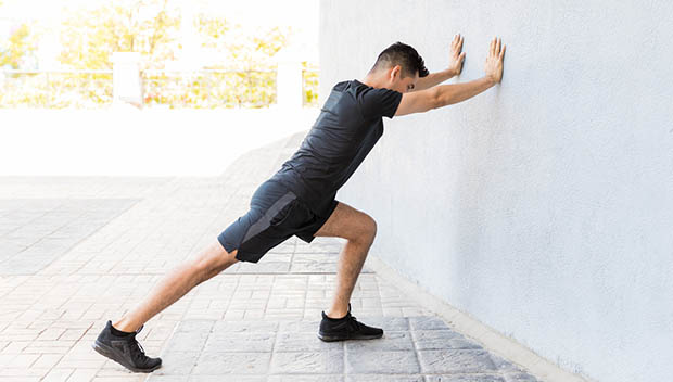 Les mollets, eux aussi, sont particulièrement chahutés pendant une randonnée de plusieurs heures. C’est pourquoi vous devrez être vigilant quant à leurs étirements. Pour les faire, c’est très simple. Alors que vous êtes debout, il vous suffit de trouver un mur contre lequel vous appuyer comme sur la figure ci-dessus. Tendez le mollet à étirer en arrière, faites en sorte que votre jambe soit tendue elle aussi puis poussez sur le mur avec vos mains, tout en prenant garde de ne pas glisser sur vos pieds. Là encore, tenez la position durant 15 secondes puis relâchez. Enfin, exécutez la même posture sur votre second mollet.