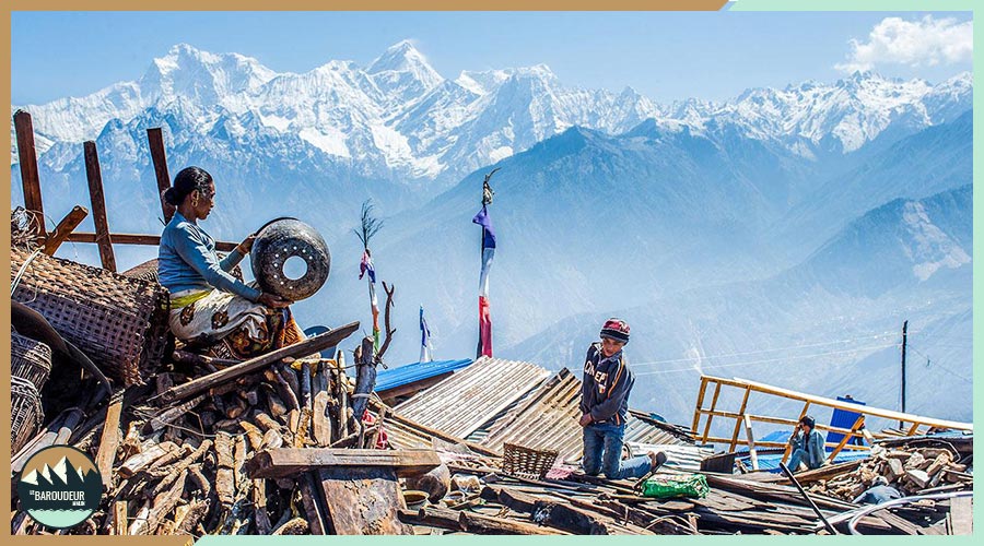 Le Népal a été frappé par un énorme tremblement de terre en avril 2015. Des milliers de personnes sont mortes dans la catastrophe et de nombreux dommages ont affecté de nombreux temples, bâtiments, routes et infrastructures de trekking.