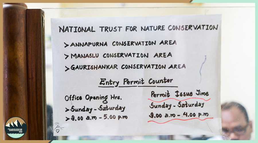 Chaque trekker au Népal a besoin d’une carte TIMS (Trekking Information Management System), qui coûte environ 16 €. Vous pouvez obtenir votre carte TIMS et payer vos frais de parc aux bureaux de l’Office du tourisme du Népal à Katmandou ou Pokhara avant votre randonnée.